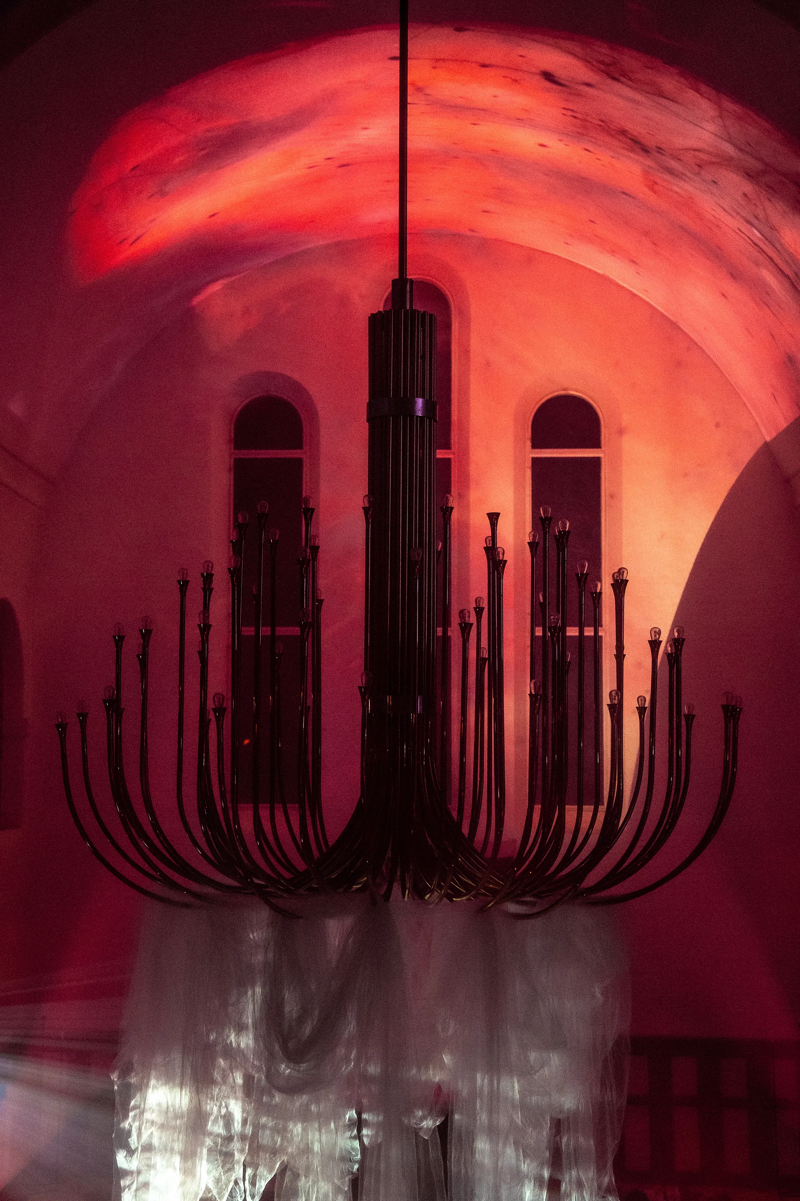 Skiftende kunstnere afløser hinanden hen over aftenen ved mixerpulten midt i rummet, og danner en collage af lyd, billede og indtryk.